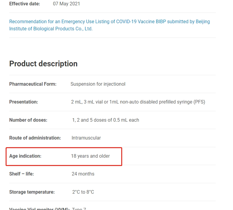 ▲The recommended age of use of COVID-19 Vaccine (Vero Cell), Inactivated of BIBP has been adjusted to people aged 18 and over on the official website of WHO.